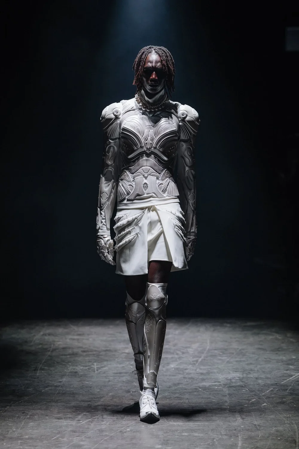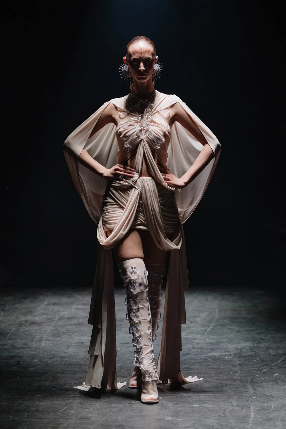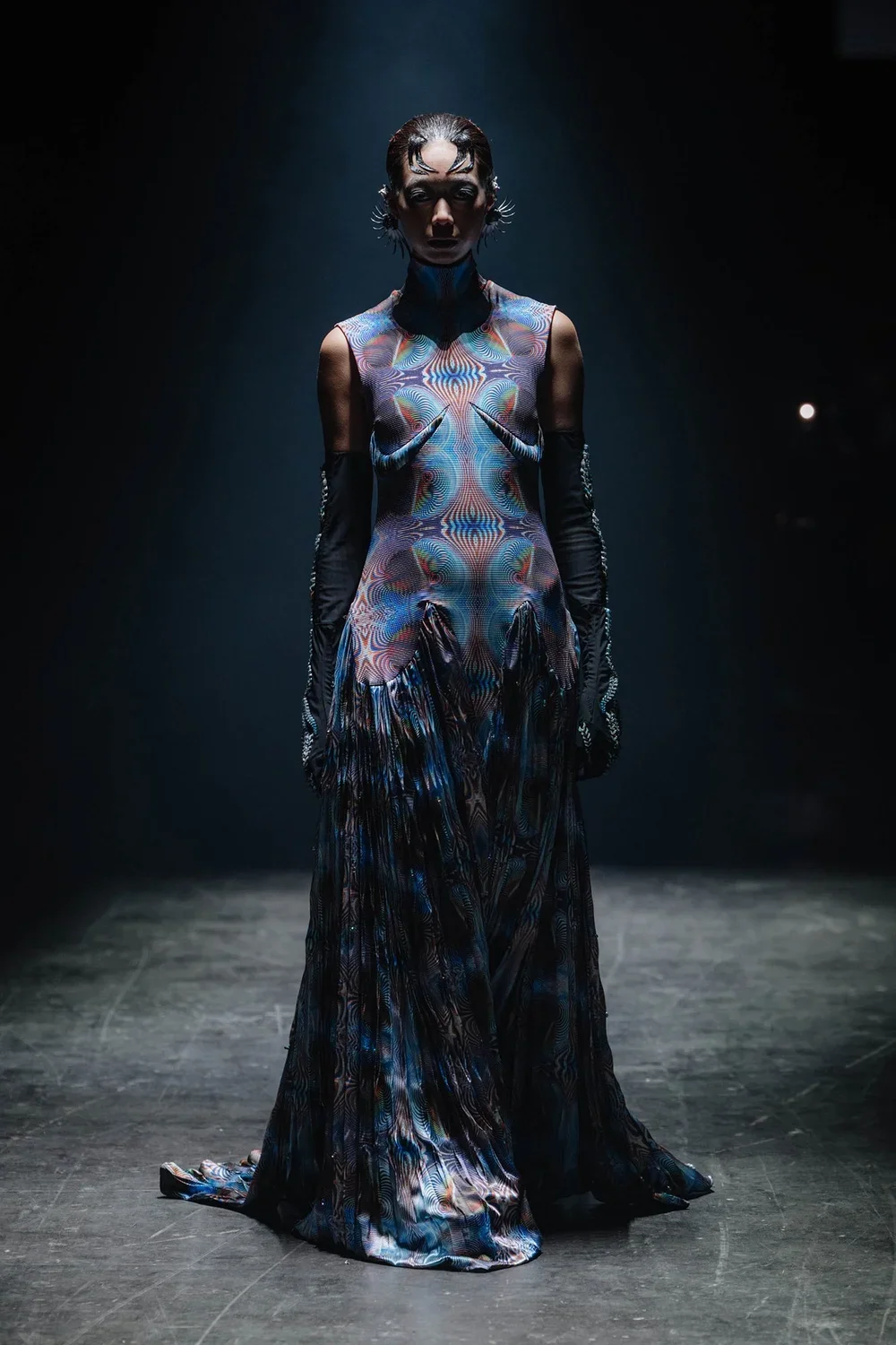 Designer Hengdi Wang explores the possibility that life began far beyond our planet—blending Eastern legends with post-human silhouettes, digital craftsmanship, and cutting-edge materials.Through 3D-printed textiles, metallic surfaces, and patterns of sacred geometry, EXOGENESIS reshapes bones, scales, and mechanical exoskeletons into garments that embody both resilience and fragility. Traditional embroidery and jacquard carry hidden codes, merging handwork with algorithms to create pieces that feel timeless and futuristic all at once.Ancient stories become cosmic memories: the creatures of Shan Hai Jing return as other-worldly forms, and Kunlun rises again as a vast starship relic drifting through time